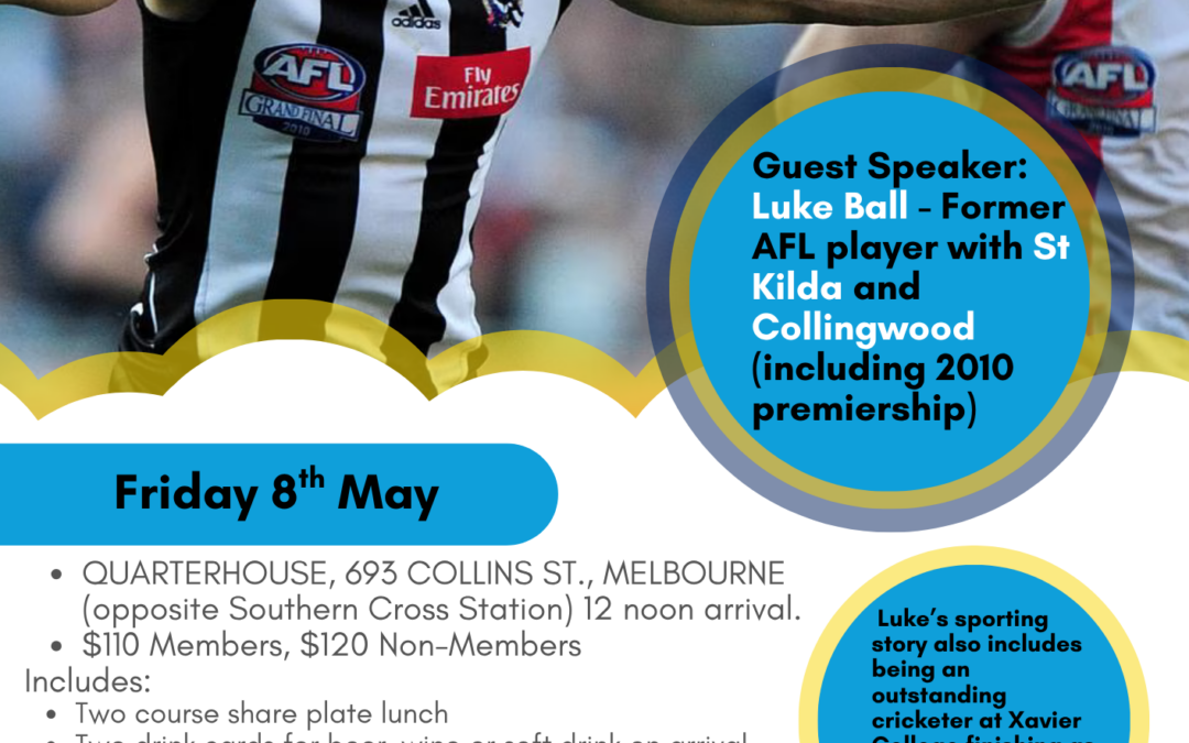 Who: Guest speaker, Luke Ball Former AFL player with St Kilda and Collingwood (including 2010 premiership). Luke’s sporting story also includes being an outstanding cricketer at Xavier College finishing as the second-highest run scorer in the college’s history.